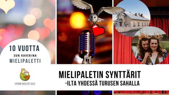 06.11.2023 Mielipaletti täyttää tänä syksynä 10 vuotta! Nuorten aikuisten Mielipaletilla tulee tänä syksynä 10 vuotta täyteen osana Hyviksen toimintaa. Synttäreitä vietetään 12.12. Mielipaletin synttärit -ilta yhdessä tapahtuman merkeissä Turusen Sahalla Pikisaaressa.... Lue uutinen