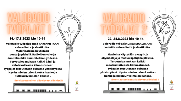 30.06.2023 Valoradio-työpajoissa rakennetaan ja maalataan yhteisötaideteosta elokuussa Voit ilmoittautua mukaan vain toiseen työpajaan tai molempiin tästä linkistä. Valoradio-työpaja 1: 14.-17.8. klo 10-14 Rakennetaan valoradioita ja -laatikoita. Materiaaleina käytetään puuta ja pleksiä.... Lue uutinen