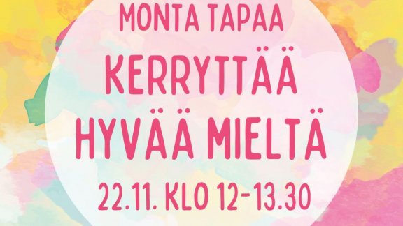 21.11.2022 Monta tapaa kerryttää hyvää mieltä 22.11. Tule poimimaan itsellesi monta tapaa kerryttää hyvää mieltä! Kaikille avoin vuorovaikutteinen luento pidetään ti 22.11.2022 klo 12-13.30 D-asemalla, Tuirassa, osoite Valtatie 53, Oulu. Aiheesta alustamassa Päivi... Lue uutinen