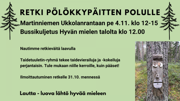 13.10.2022 Retki Pölökkypäitten polulle 4.11. klo 12-15 Tervetuloa mukaan retkelle Pölökkypäitten polulle Martinniemen Ukkolanrantaan pe 4.11! Lähtö Hyvän mielen talolta klo 12.00 ja paluu klo 15.00. Nautimme laavulla retkieväitä. Retki on maksuton. Ilmoittautuminen... Lue uutinen