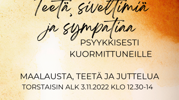 19.10.2022 Teetä, siveltimiä ja sympatiaa Toppilan Yhteisötila Alvarissa Torstaisin 3.11. alkaen klo 12.30-14.00, Yhteisötila Alvari, Kuorimokatu 1, 90520 Oulu Psyykkisesti kuormittuneille. Ohjattu taidetehtävän aloitus, jonka jälkeen vapaata maalausta. Loppuajan voi juoda teetä, jutella... Lue uutinen