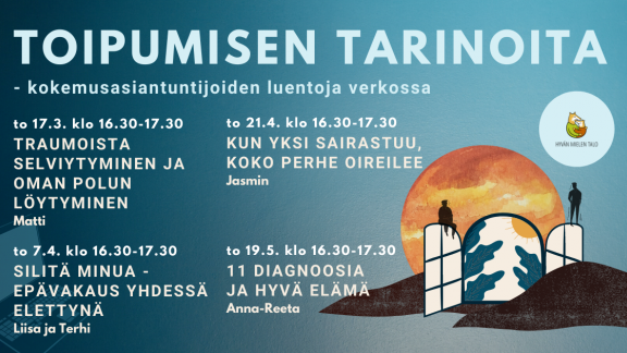 23.02.2022 Toipumisen tarinoita - kokemusasiantuntijoiden luentoja verkossa Torstaisin 17.3., 7.4., 21.4. ja 19.5. klo 16.30-17.30 Luennoilla kokemusasiantuntija kertoo oman toipumisen tarinansa, jonka jälkeen yleisöllä on mahdollista kysyä ja käydä keskustelua aiheesta. Luennot... Lue uutinen
