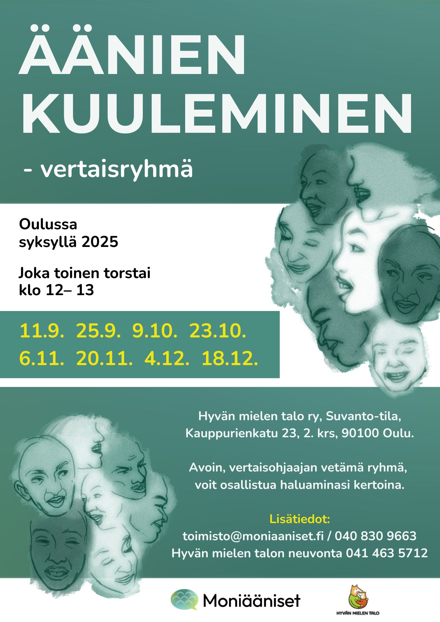 Julkaistu 03.09.2025 Ääniä kuulevien vertaistukiryhmä kokoontuu. Tervetuloa! Puhuminen on avain kohti tasapainoisempaa elämää äänien kuulemisen kanssa. Äänien kuulemisesta kokemusta omaava, tule siis sinäkin keskustelemaan kokemuksistasi vertaistukiryhmään parittomien viikkojen torstaisin klo 12-13! Ryhmää ohjaavat vertaistukiohjaajat ja keskustelua käydään hyväksyvässä ja luottamuksellisessa ilmapiirissä. Ryhmä kokoontuu Hyvän mielen talolla Suvanto-tilassa. Ryhmään ei tarvitse ilmoittautua. Ryhmä toteutetaan Hyvän mielen talon ja Suomen Moniääniset ry:n yhteistyönä. Lisätietoa: Päivi Isojärvi, paivi.isojarvi@hyvanmielentalo.fi, p. 041 4667 683. Yli 10 % ihmisistä kuulee ääniä, joilla ei ole ulkopuolista aiheuttajaa. Suurimmalle osalle heistä äänien kuuleminen ei ole elämää häiritsevä ilmiö. Muutamalle prosentille ihmisistä äänien kuuleminen on kuitenkin häiritsevää. Ryhmään osallistuminen auttaa hyväksymään äänet osana itseä ja löytämään hallintakeinoja, jotka helpottavat arjessa selviytymistä.