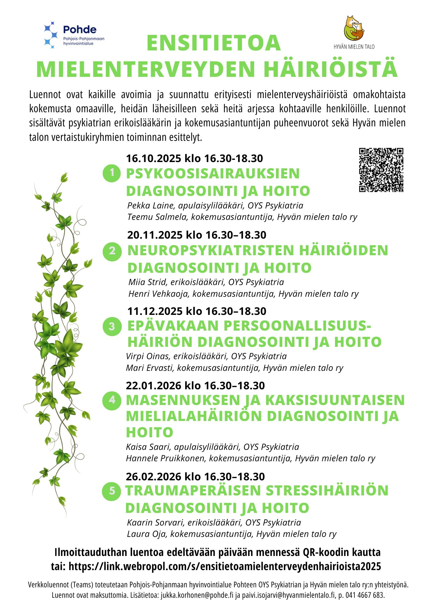 Julkaistu 02.12.2025 Epävakaan persoonallisuushäiriön diagnosointi ja hoito -luento 11.12.2025 klo 16.30-18.30 Verkkoluennolla kuulet psykiatrian erikoislääkäri Virpi Oinaan luennon, kokemusasiantuntija Mari Ervastin puheenvuoron sekä Hyvän mielen talolla kokoontuvan Epävakaa persoonallisuushäiriö -vertaistukiryhmän esittelyn. Luento on kaikille avoin ja maksuton, ja se on suunnattu erityisesti mielenterveyshäiriöistä omaa kokemusta omaaville, heidän läheisilleen ja perheenjäsenilleen, sekä heitä arjessaan kohtaaville henkilöille. Ilmoittauduthan 10.12. mennessä tästä. Lisätietoa: paivi.isojarvi@hyvanmielentalo.fi, p. 041 4667 683 ja jukka.korhonen@pohde.fi