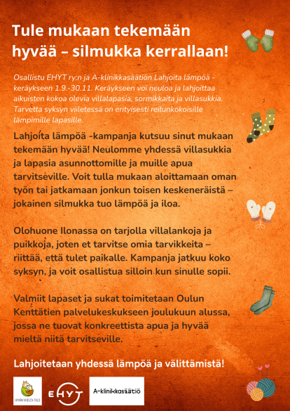 Julkaistu 02.09.2025 Lahjoita lämpöä -keräys kutsuu sinut mukaan tekemään hyvää! Syksyn mittaan neulomme Hyviksen Kohtaamoissa villasukkia ja lapasia asunnottomille ja muille apua tarvitseville. Keräykseen voi neuloa ja lahjoittaa aikuisten kokoisia villalapasia, sormikkaita ja villasukkia. Syksyn viiletessä tarvetta on erityisesti reilunkokoisille, lämpimille lapasille. Voit tulla mukaan aloittamaan oman työn tai jatkamaan jonkun toisen keskeneräistä – jokainen silmukka tuo lämpöä ja iloa. Olohuone Ilonassa on tarjolla villalankoja ja puikkoja, joten et tarvitse omia tarvikkeita – riittää, että tulet paikalle. Kampanja jatkuu koko syksyn, ja voit osallistua silloin kun sinulle sopii. Valmiit lapaset ja sukat toimitetaan Oulun Kenttätien palvelukeskukseen joulukuun alussa, jossa ne tuovat konkreettista apua ja hyvää mieltä niitä tarvitseville. Osallistu EHYT ry:n ja A-klinikkasäätiön Lahjoita lämpöä -keräykseen 1.9.–30.11. 💛 Lahjoitetaan yhdessä lämpöä ja välittämistä!