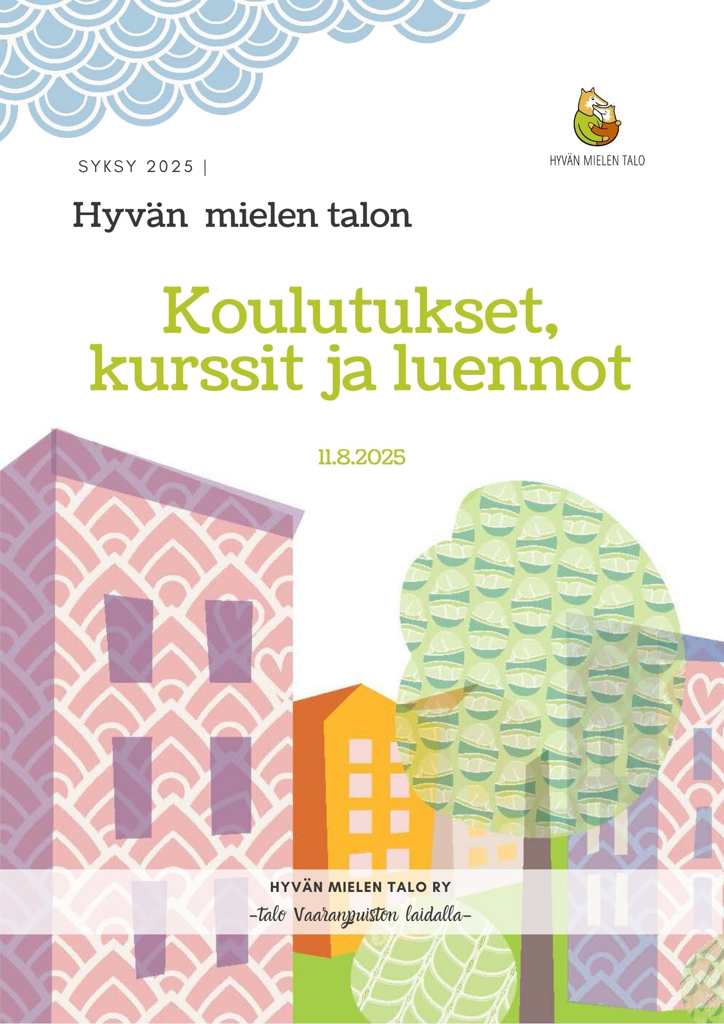Julkaistu 12.08.2025 Tervetuloa syyskauden koulutuksiin ja luennoille Syyskauden koulutusesitteemme on ilmestynyt. Tarjolla on sekä mielen hyvinvointia tukevia koulutuksia että vapaaehtois- ja kokemustoiminnassa tarvittavia tietoja ja taitoja vahvistavaa koulutusta. Mielen lukutaito -koulutuksista järjestämme Mielen hyvinvointi-, Mielenterveyden ensiapu®-, sekä meillä uutena, Nuori mieli -koulutukset. Ensitietoluentosarjassa saat perustietoa mielenterveyden häiriöistä, hoidosta, vertaistuesta ja toipumisesta. Luennoilla kuulet psykiatrian erikoislääkäreiden ja kokemusasiantuntijoiden puheenvuorot. Lisäksi niiden yhteydessä esitellään Hyvän mielen talon vertaistukiryhmien toimintaa. Luennot toteutetaan verkkoluentoina, joten osallistuminen luennoille on mahdollista myös matkan päästä. Voit toteuttaa myös yhteisen "luentokatsomon" lähipiirin tai esim. oman yhdistyksen tai muun yhteisön kanssa. Tutustu syyskauden koulutusesitteeseemme tästä. Lisätietoa: Koulutustoiminnan koordinaattori Päivi Isojärvi, paivi.isojarvi@hyvanmielentalo.fi, p. 041 4667 683.
