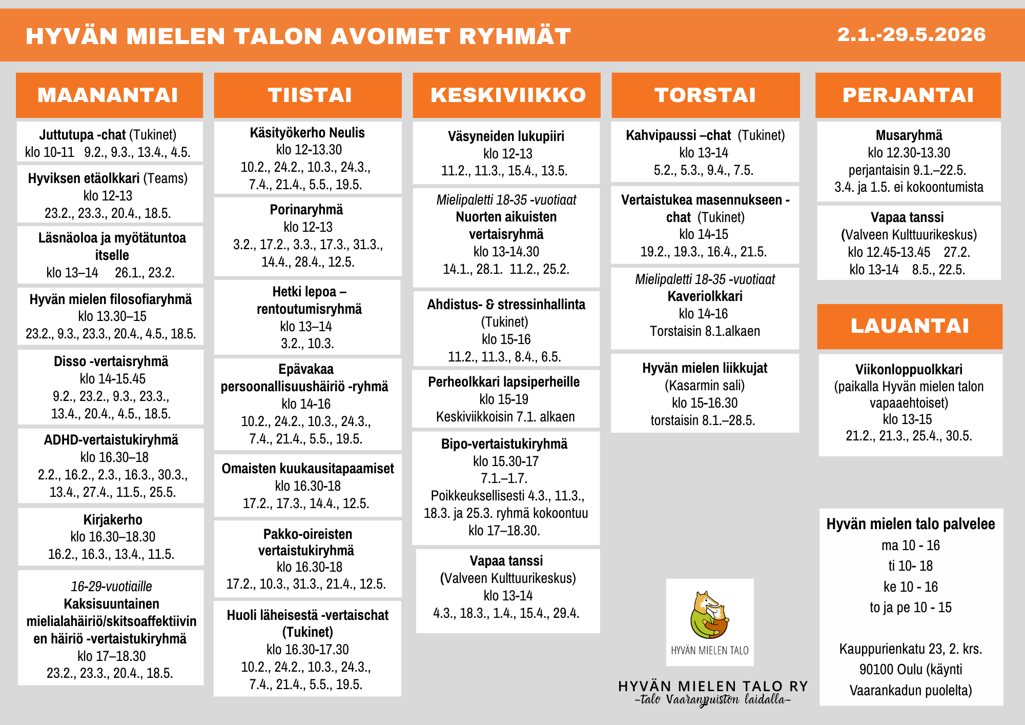 Pahoittelut ja tervetuloa porinoille Hyviksen Kohtaamoon arkipäivisin klo 10–12 ja tiistaisin klo 16–18