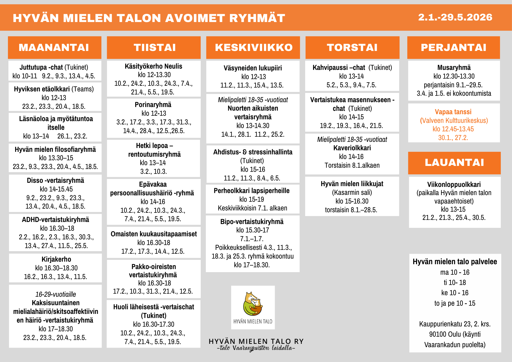 Ahdistus- & stressinhallinta (verkossa, Tukinet) Vertaistukea verkossa ahdistusta ja stressiä kokeville. Hyvän mielen talon chatissa pääset käymään vertaistuellisia keskusteluja muiden samassa tilanteessa olevien kanssa, jakamaan ahdistukseen ja stressiin liittyviä ajatuksia, kokemuksia sekä selviytymiskeinoja ja vinkkejä. Chat on auki keskiviikkoisin 11.2., 11.3., 8.4. ja 6.5. klo 15–16. Huoli läheisestä -vertaischat (Tukinet) Kaipaatko tukea, kun läheisen mielenterveys tai oma jaksaminen mietityttää? Huoli läheisestä -chat tarjoaa mahdollisuuden keskustella anonyymisti muiden samankaltaisessa tilanteessa olevien kanssa. Huoli, epävarmuus ja uupumus ovat yleisiä tunteita – et ole yksin. Chatissa voit jakaa ajatuksiasi ja saada vertaistukea. Chat on avoinna 10.2., 24.2., 10.3., 24.3., 7.4., 21.4., 5.5. ja 19.5. klo 16.30–17.30. Hyviksen kahvipaussi –chat (Tukinet) Pidä tauko ja pysähdy hetkeksi. Piipahda Hyviksen kahvipaussi -chatissa vaihtamassa kuulumisia rennossa ilmapiirissä, chat on auki torstaisin 5.2., 5.3., 9.4. ja 7.5. klo 13–14. Juttutupa-chat (Tukinet) Avoin chat kaikille hyvinvoinnista ja mielenterveydestä kiinnostuneille. Chatissa puhutaan arkeen ja jaksamiseen liittyvistä asioista, vaihdellaan kuulumisia sekä vinkkejä mielialan kohottamiseen. Tervetuloa porinoille 9.2., 9.3., 13.4. ja 4.5. klo 10–11. Vertaistukea masennukseen -chat (Tukinet) Oletko tuntenut itsesi masentuneeksi tai alakuloiseksi viime aikoina? Tule vertaischattiin jakamaan kokemuksia ja ajatuksia masennuksesta ja siitä toipumisesta. Chat on auki torstaisin 19.2., 19.3., 16.4. ja 21.5. klo klo 14–15.